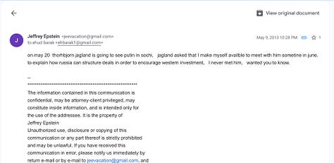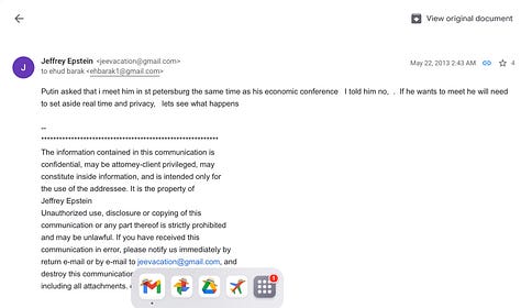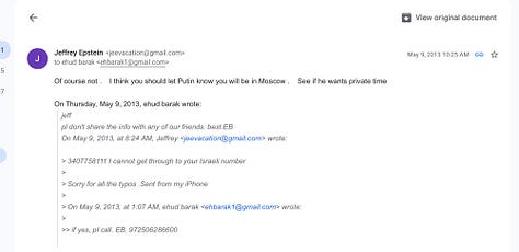 This wasn’t idle gossip. Epstein shared it with Ehud Barak – the former Israeli Prime Minister, who weeks later met Putin himself and could easily verify the claim through Kremlin channels.