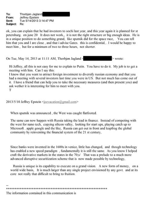 Writing on 22 May 2013, Epstein revealed: “Putin asked me to be in St Petersburg the same time as his conference to set real time and privacy. Lets see what his economic conference told him. If he wants to meet he will need.”